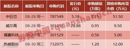 本周(8月28日~9月1日)共有4只新股申购。具体来看,周一2只:中巨芯、威尔高;周二1只:福赛科技;周三1只:热威股份。