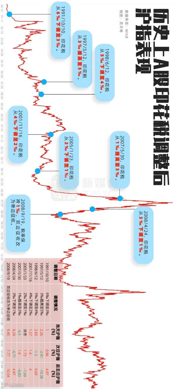 自1990年以来,我国股票交易印花税有过多次调整,每次对印花税的调整均可以带动短期交易情绪上升。印花税下调时,A股市场往往容易出现走牛行情,而印花税上调时,A股市场更容易走弱。例如,最近一次的2008年9月19日,印花税由双边征收改为单边征收(买方不再征收),税率保持1‰。当天沪指创下史上第三大涨幅,收盘时上涨9.45%,当天两市个股全部涨停。2008年4月24日,财政部将证券交易印花税税率由3‰调整为1‰。当天,沪指收盘大涨9.29%,大盘接近涨停。2007年5月29日晚,官方宣布印花税由1‰上调到3‰,这是1997年以来10年间唯一的一次上调。5月30日当日大盘暴跌6.5%,之后几天,市场继续下跌,最低跌了15%。但随后又震荡开启升势,朝着历史高点6124点前进。总体上来看,虽然每一次调整会造成行情短期的大幅震荡,但并不影响整体走势。