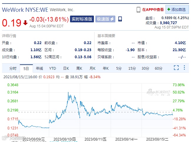 作为全球共享办公的鼻祖,曾经在全球掀起了一轮共享办公创投热潮、估值一度接近500亿美元最具价值的初创公司,在2021年上市以来股价下跌了99%。在近几天的舆论发酵之下,截至8月15日市值已经只有4.10亿美元。