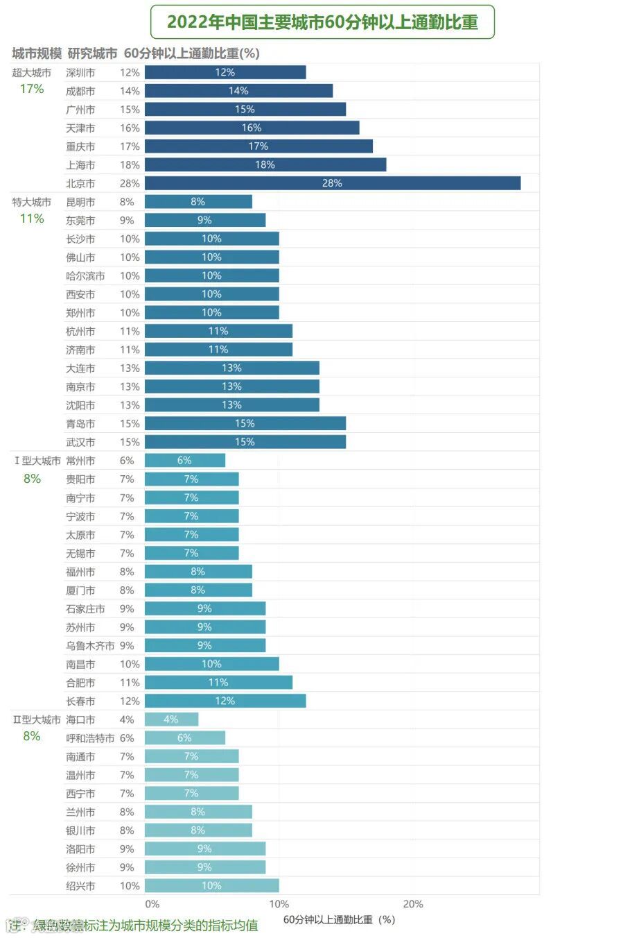 8月18日,住建部城市交通基础设施监测与治理实验室、中国城市规划设计研究院等联合发布《2023年中国主要城市通勤监测报告》。报告显示,全国主要城市60分钟以上通勤人口比重12%,仍有超过1400万人口承受极端通勤。其中,北京60分钟以上通勤人口比重28%,虽仍是全国最高,但同比降低2个百分点;武汉60分钟以上通勤比重15%,同比增加1个百分点,是特大城市极端通勤最严重的城市。