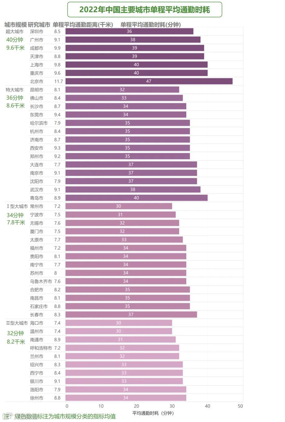 报告以全国45个轨道运行城市为监测对象。从单程通勤时耗来看,北京单程通勤时耗47分钟,同比减少1分钟,仍是通勤时耗最长的城市。上海、重庆、青岛单程通勤时耗也达到40分钟。