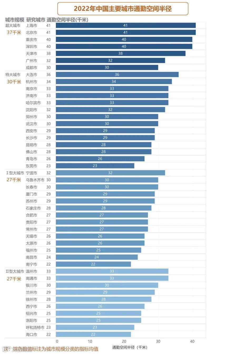 通勤空间半径反映城市紧密通勤联系的空间范围,在一定程度上体现城市的辐射能力。根据报告,北京、上海是通勤空间尺度最大的城市,半径41公里,上海同比增加1公里。深圳和重庆通勤空间尺度也达到40公里,同比增加1公里。33个城市通勤空间半径同比增加。其中,成都通勤空间半径达到30公里,温州33公里,同比增加2公里,是年度增幅最大的城市。