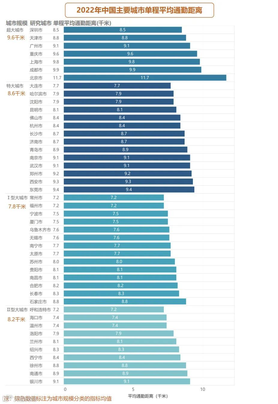 平均通勤距离体现真实职住分离情况,也是城市运行的成本,决定着基础设施投入与交通压力。数据显示,北京平均通勤距离11.7公里,同比增加0.4公里,仍是通勤距离最长的城市。此外,10个城市平均通勤距离超过9公里。除上海市、重庆市、广州市外,成都市、武汉市、东莞市、西安市、南京市、郑州市、银川市平均通勤距离首次超过9公里。