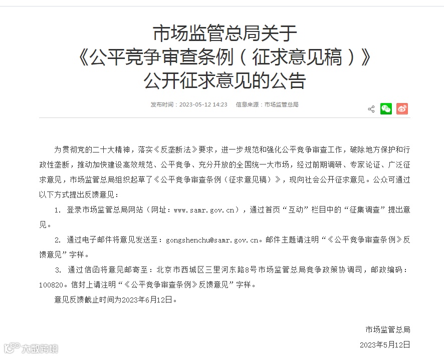 来源:国家市场监督管理总局竞争政策协调司官网