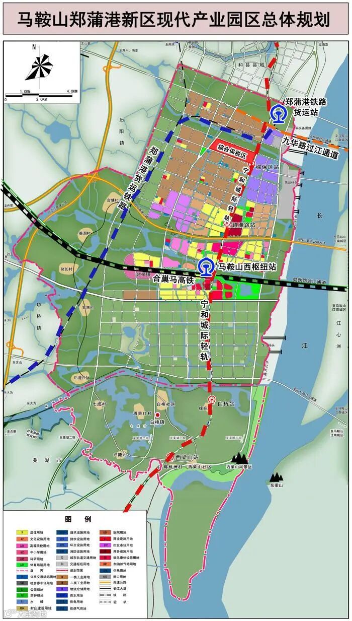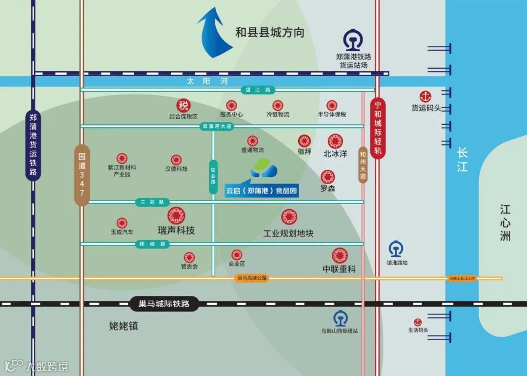 【高速铁路 迎接四方】距南京南站 40 公里、距合肥南站 100 公里,街接中欧班列的郑蒲港铁路已通车,合巢马城际高铁、位于郑蒲港新区的马鞍山西站正在加速建设中。