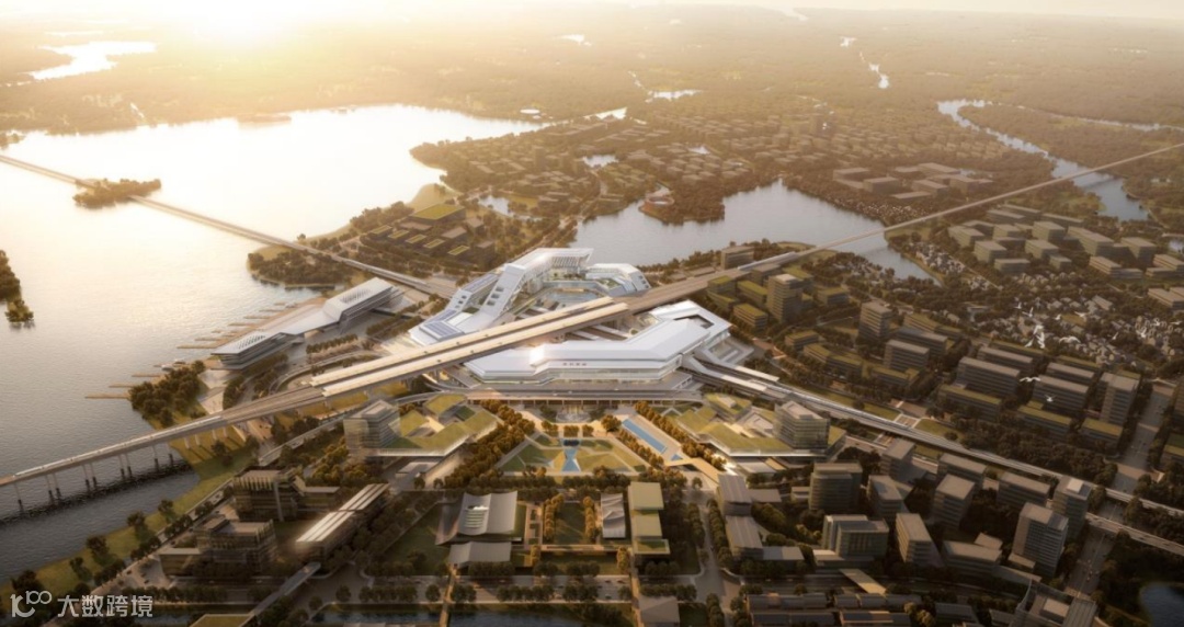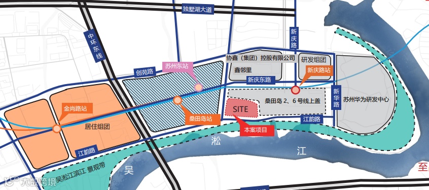 出小区南大门则是吴淞江滨江景观带步道。东侧是轨交2号线桑田岛站,西侧是2024年计划投运的轨交6号线新庆路站。桑田街一街之隔是正在建设的苏嘉高铁苏州东站综合体。