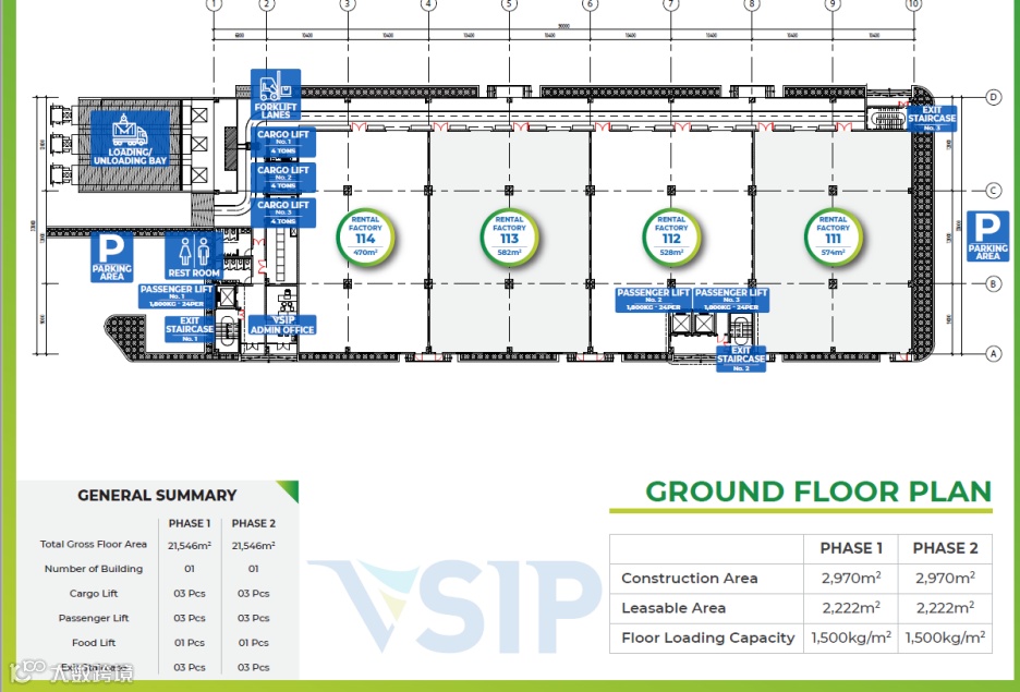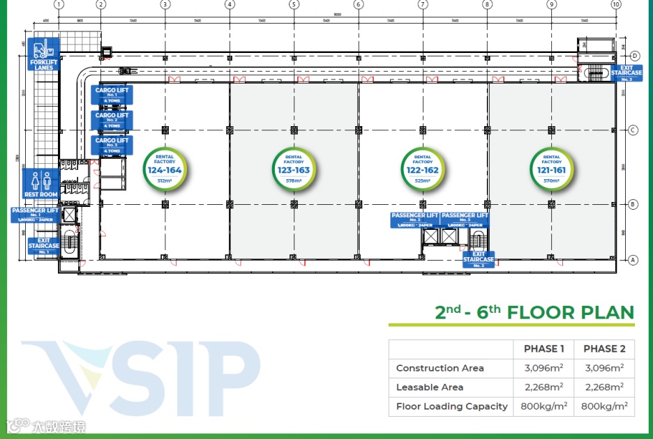 -第二到第六楼:2222平米每层,高度:4米,承重800公斤
