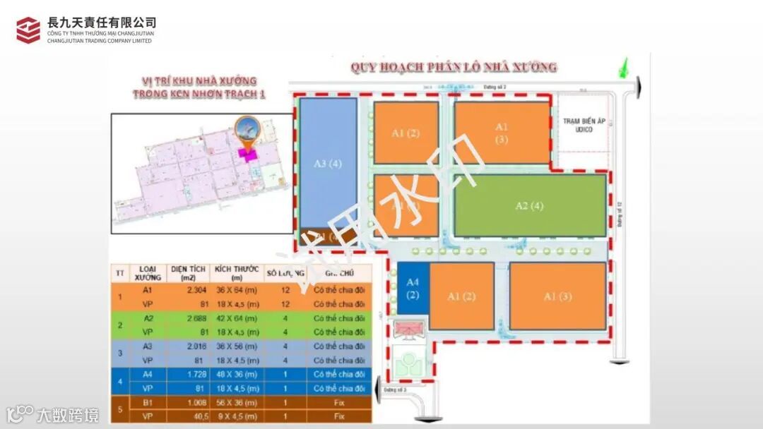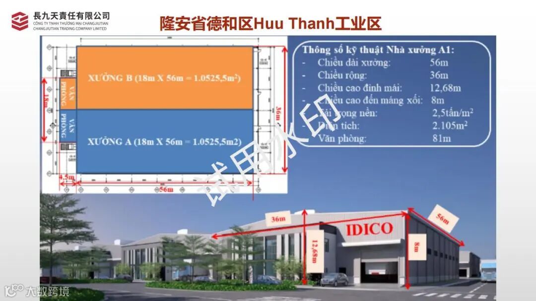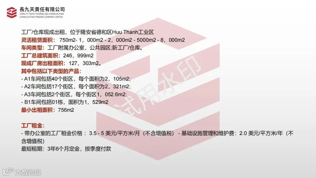 - 带办公室的工厂租金价格 :3.5 - 5 美元/平方米/月(不含增值税) - 基础设施管理和维护费:2.0 美元/平方米/年(不含增值税)