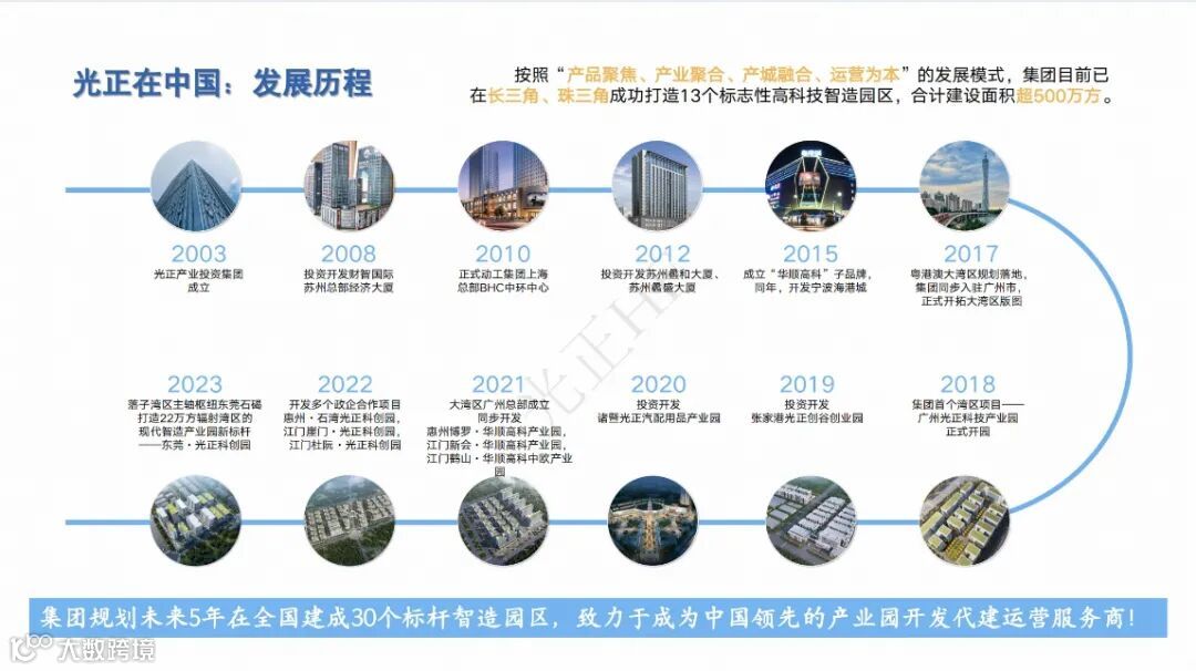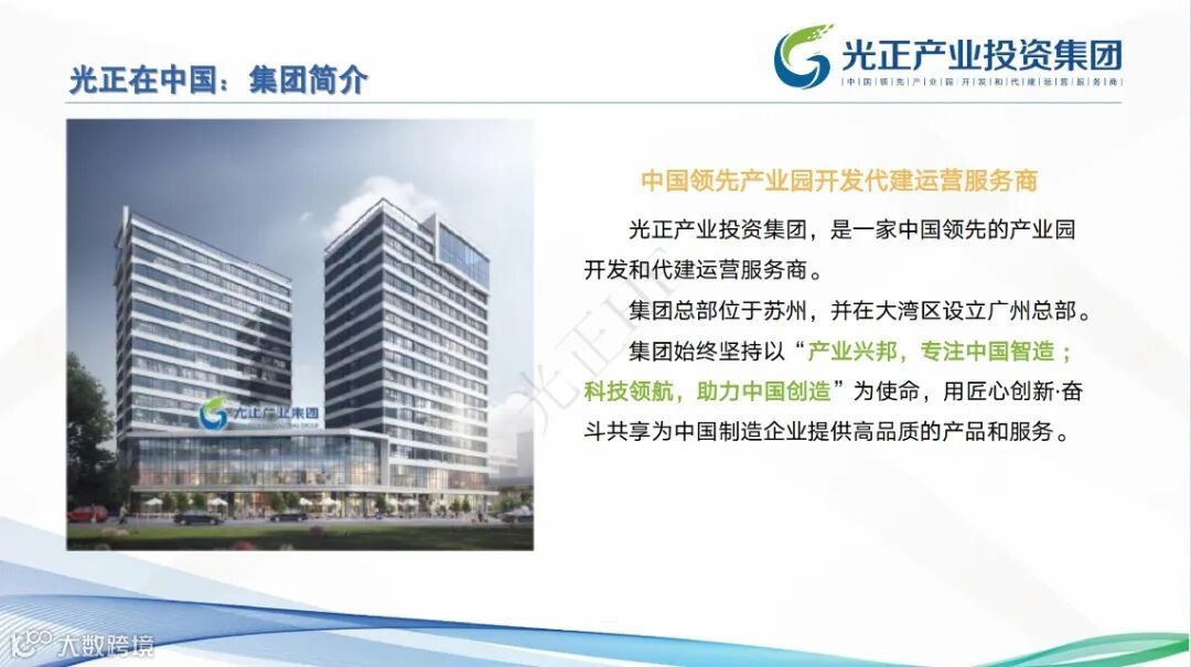 光正产业投资集团深耕长三角二十余年,是一家国内领先的产业园开发和代建运营服务商。集团总部位于苏州,2018 年进驻粤港澳大湾区,设立广州总部。目前聚焦中国产业发展最优质的长三角和珠三角两大区域,采取双擎驱动发展的模式。