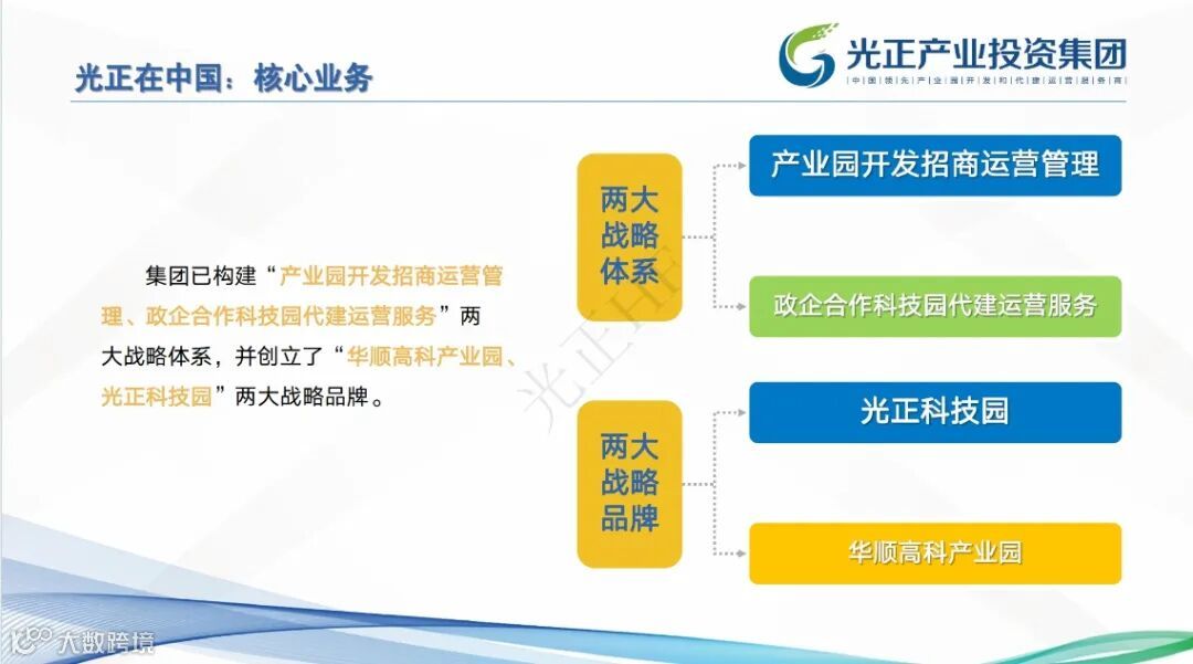 集团旗下拥有“华顺高科产业园、光正科技园”两大战略品牌,涵盖“产业园开发招商运营管理、政企合作科技园代建运营服务”两大战略体系。目前,集团在全国开发运营的产业园区已经超过 500 万方,致力成为国内领先的产业园开发和代建运营服务商。