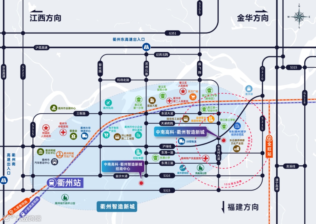 项目周边交通便捷,沪昆高速、溧宁高速、杭金衢高速环绕,距离沪昆高速入口和出口分别仅10.56公里和10.57公里,距离溧宁高速出口和入口分别为19.88公里和20.05公里,距离杭金衢高速衢江互通连接线入口和出口分别为14.61公里和14.62公里。此外,项目还毗邻衢州机场和衢州火车站,方便企业货物的进出口和商务出行。