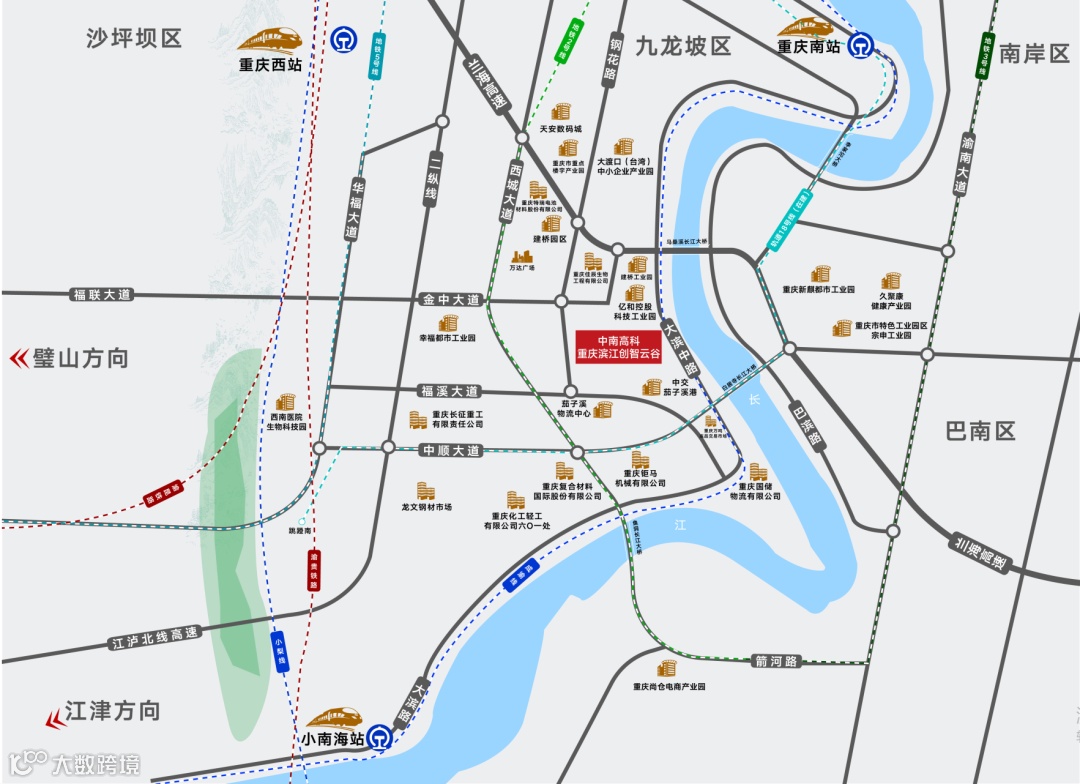 园区距大渡口区政府5.4km,距重庆江北机场35km,重庆西站 8.6km,距轨道交通2号线金家湾站 2.5km,距内环快速路2.3km。