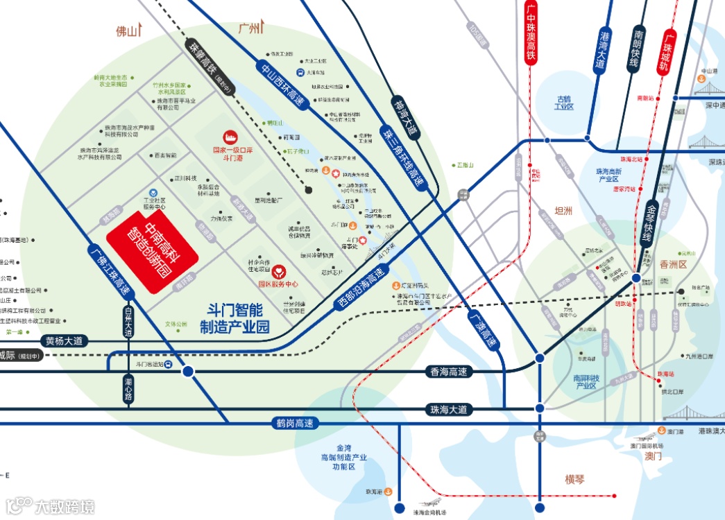 中南高科·智造创新园距离西部沿海高速、广佛江珠高速斗门收费站约8公里。此外,园区距离中山西环高速神湾南约6公里,距离香海大桥也仅约8公里。香海大桥跨越珠海、中山两市,大大缩短斗门至珠海市区的通勤时间。通过香海高速,未来经深中通道(在建中)、深珠通道(规划中),可快速直达深圳宝安、前海。