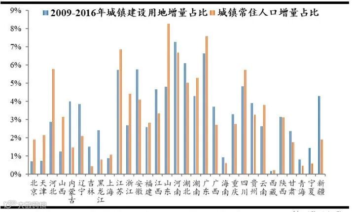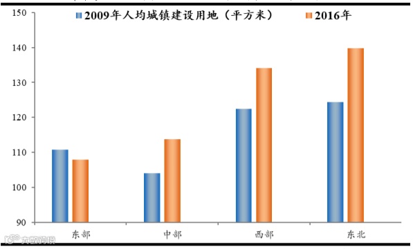 2009-2016年东部地区城镇建设用地增量比例低于人口增量比例,相对应的,东部人均建设用地减少,中、西部人均建设用地增加。土地资源配置极不均衡(见图2)。