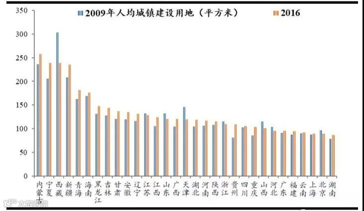 分城市看,2006-2016年1000万人以上城市人口增长36%,但土地供给增长仅仅14.4%。在城区建设用地增幅方面,呈现出明显的中间大、两头小的特点,即1000万人以上的超大城市和20万人以下的城市建成区增幅均在20%左右,其余城市的建成区增幅均超20%。从变化趋势看,2009-2016年,北京、浙江、天津等8省人均城镇建设用地面积明显下降,并且除西藏外的其他省份人均城镇用地水平原本较低,表明土地供给偏少(见表1)。
