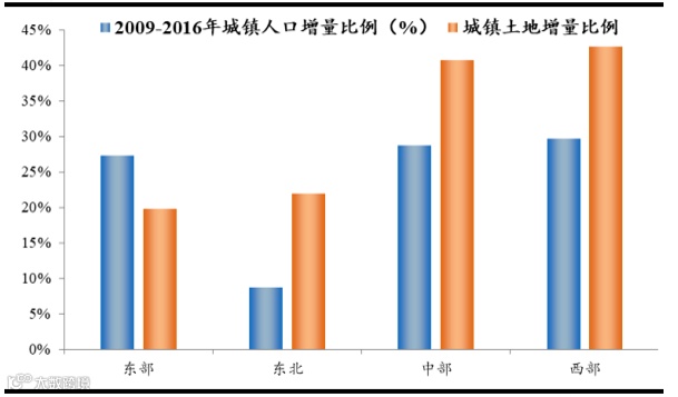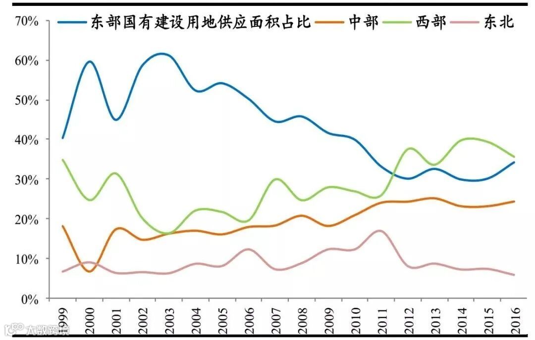 根据自然资源部和国家统计局数据,1999-2016年东部地区建设用地供应占比逐渐减少,东北地区保持低值稳定,中、西部地区逐年增多(见图1)。