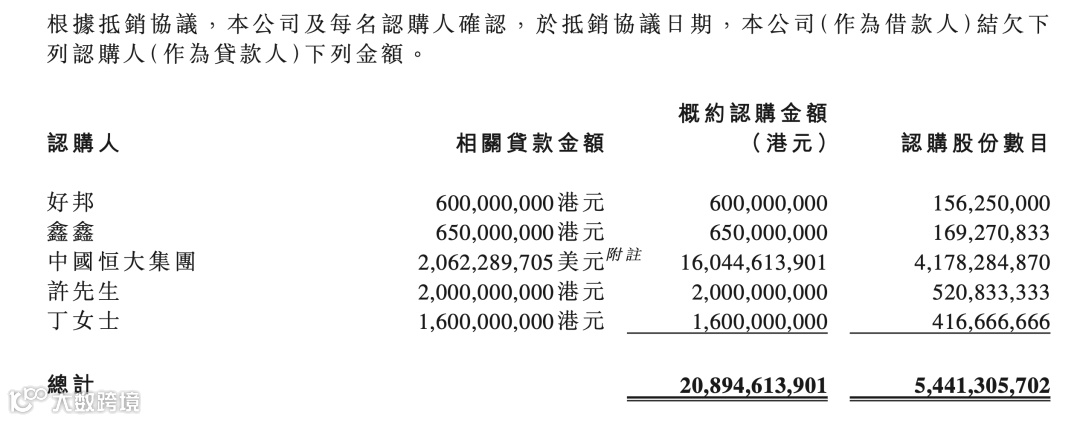 8月14日,恒大汽车在港交所发布公告称,恒大新能源汽车与认购方订立股份认购协议及抵销协议,中国恒大集团认购41.78亿股,许家印认购5.2亿股,丁玉梅认购4.17亿股,好邦认购1.56亿股,鑫鑫认购1.69亿股。认购价为每股3.84港元,较每股恒大新能源汽车股份于2023年8月11日的收市价1.49港元有溢价157.7%,总认购金额为约208.95亿港元。