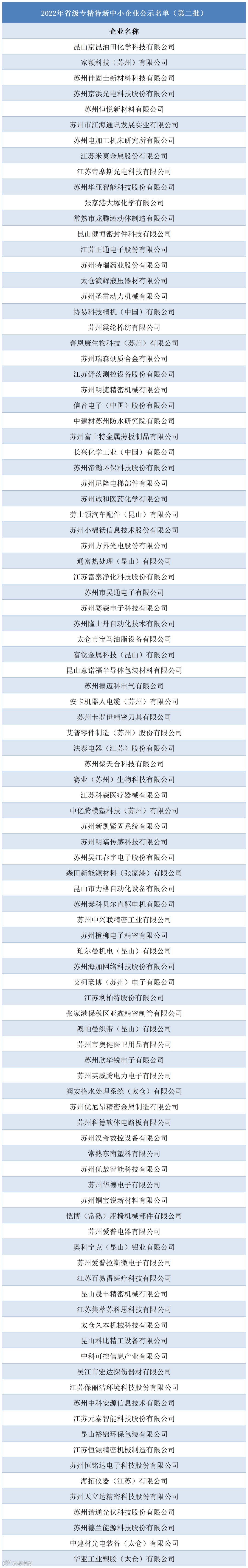 为深入贯彻党中央、国务院和省委、省政府关于加快培育专精特新中小企业的决策部署,根据工业和信息化部《优质中小企业梯度培育管理暂行办法》,江苏省工信厅组织开展了2022年度省级专精特新中小企业申报认定和2019年度省级专精特新企业复核工作,已按规定和程序完成相关审核,现将我市通过审核的企业名单予以公示(第二批)。公示期为2022年12月1日至12月7日,欢迎社会各界参与监督。如有异议,请在公示期内实名反馈江苏省工业和信息化厅,并提供佐证材料和联系方式,以便核实查证。