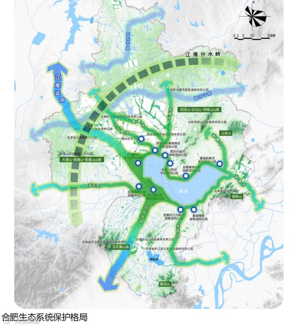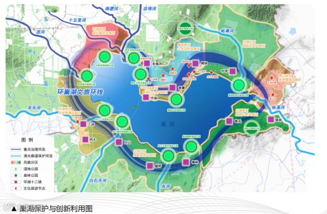岭湖辉映:以巢湖为核心、以江淮分水岭为屏障,构建蓝绿交织、山水交融的全域生产生活生态融合发展格局。