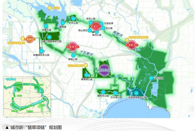 传承经典的“环城公园”建设模式,在城市内部依托南淝河、十五里 河等主要河流,串联重要节点,打造城市新“翡翠项链”,成为未来城市最靓丽的风景线。