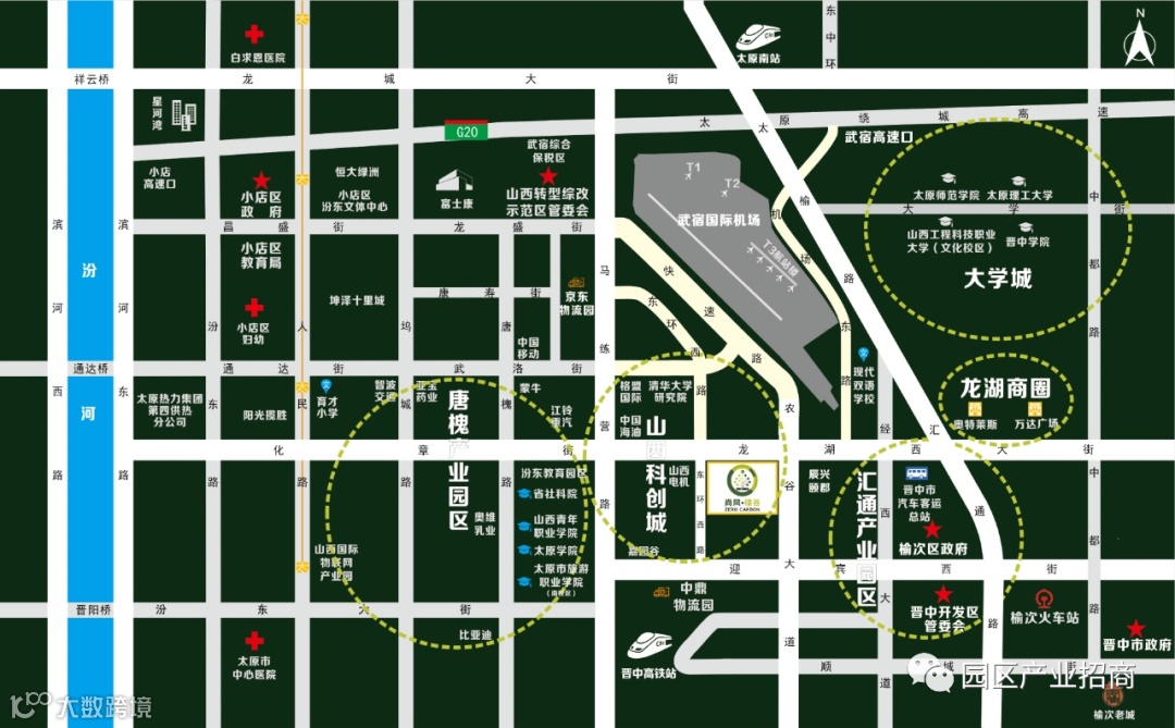陆空铁三位一体交通,太榆科创块核心区,北临武宿机场,东接龙距离机场10分钟,高铁站5分钟车程。