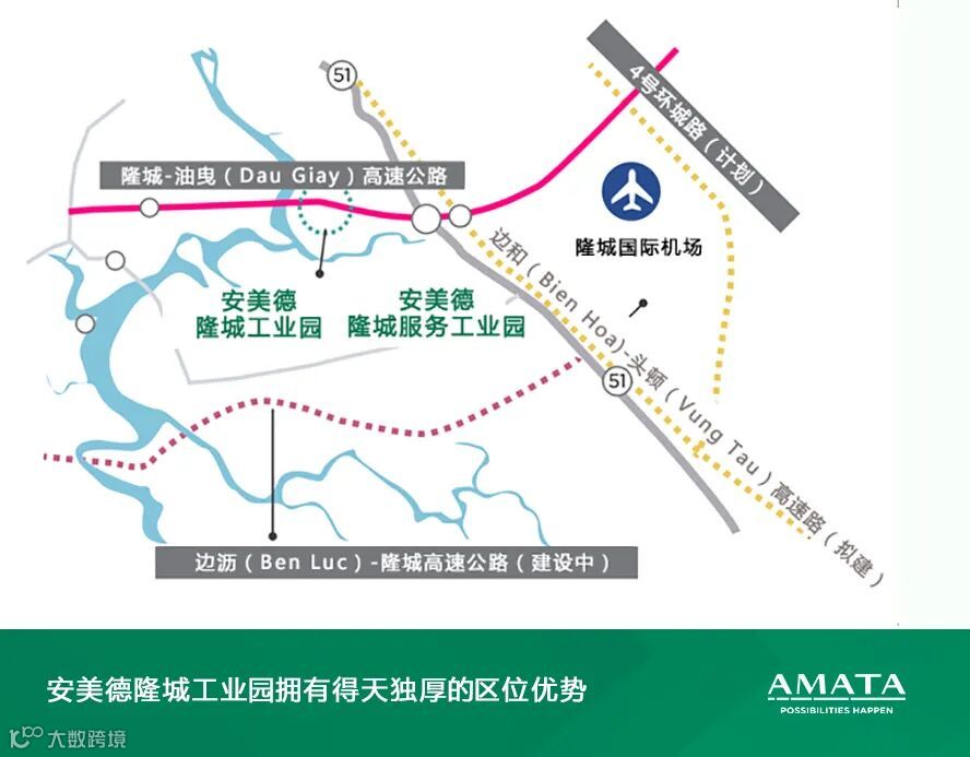 安美德隆城工业城位于同奈省隆城区,有着得天独厚的区位优势。安美德项目地理位置优越,距离隆城新大型机场项目仅 10 公里,与胡志明市-隆城高速公路直接相连,预计发展前景极佳。