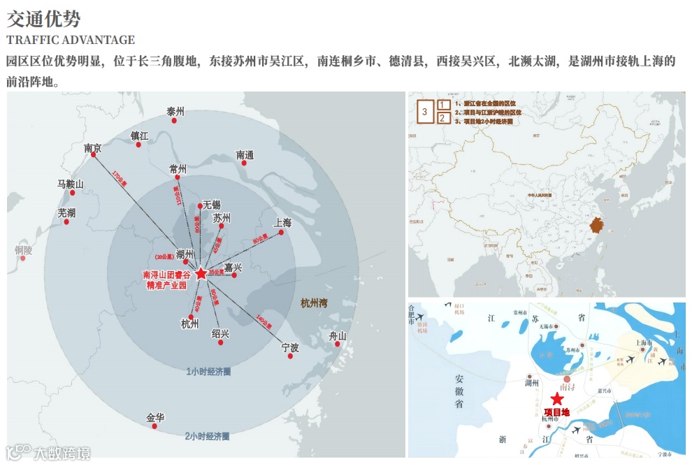 立体交通路网,长三角经济圈。项目位于长三角腹地,东接苏州市吴江区,南连桐乡市、德清县,西接吴兴区,北濒太湖,区位优势独特,是湖州巿接轨上海的前沿阵地。318国道和湖盐公路贯通全境,京杭运河和长湖申航道穿境而过,距离上海、苏州、杭州等大城市均为100公里左右。区域内,申苏浙皖高速公路、申嘉湖高速公路等路网四通八达,距离上海虹桥机场1.5个小时车程,交通优势明显!