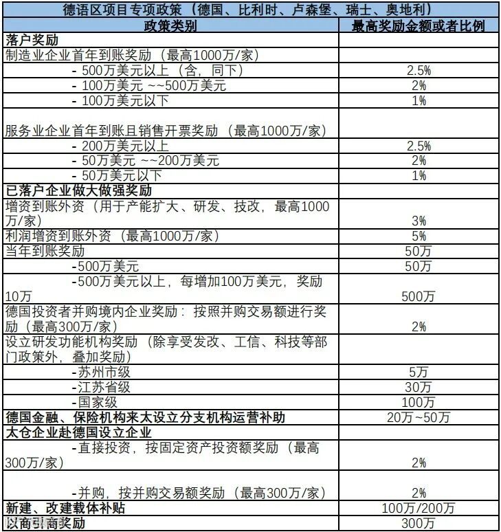 鼓励在太德企通过产业链招商、供应链招商、以商引商等模式为太仓招引德资项目,引荐项目落户且注册外资到账 15%的,按到账外资的 3‰~1%给予一次性引荐奖励,奖励上限为 300 万元