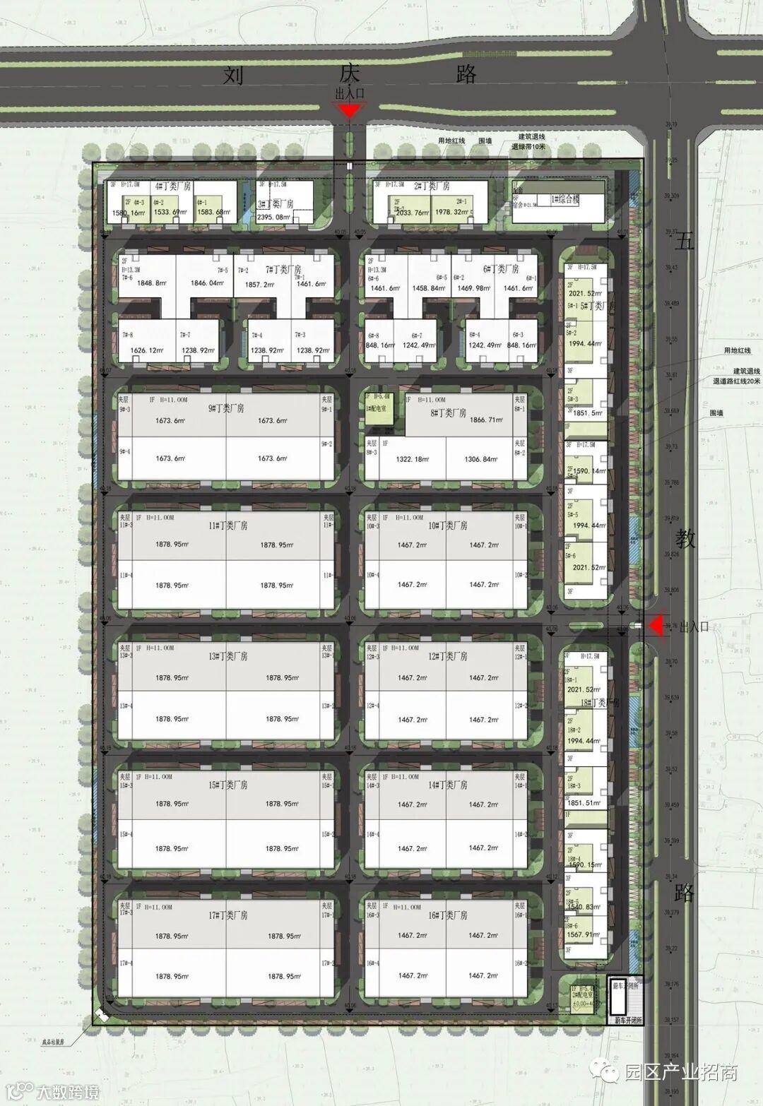 3、建筑周圈外侧设置为物流进出口,院落内部为景观区,为厂房人行进出口,整体流线动静分流。院落式布局也提高了园区的土地利用率,又可形成一些半封闭的内部院落空间。