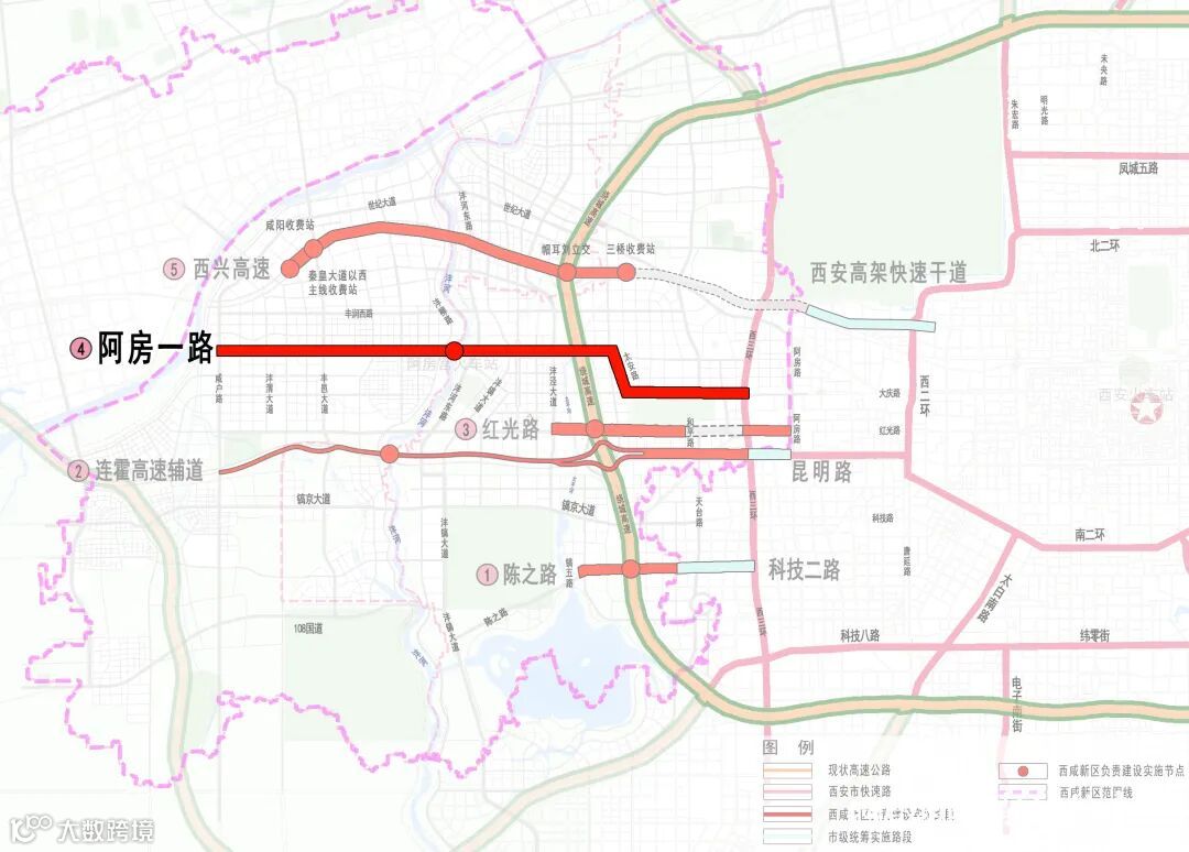 阿房一路沣东段,东起西三环,向西跨绕城高速后至沣河东路,全长8.5公里,是西三环与国际足球中心的快速连接的重要道路。目前,已完成管道工程3000米,道路沥青铺设500米。沣西段,东起沣河东路,西至咸户路,全长7公里,目前已建成通车1公里,阿房一路跨沣河桥正在进行桩基施工。