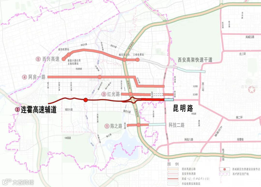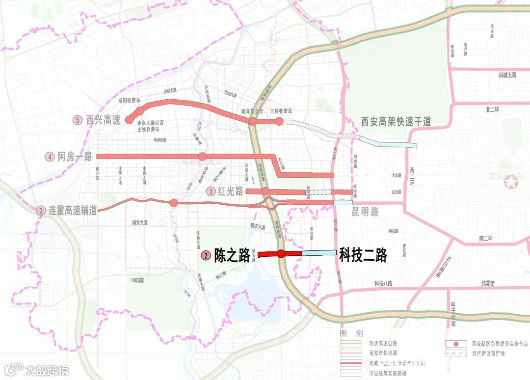 陈之路—科技二路项目,西起豫章大道,东至西咸高新界,全长约2.7公里,采用高架和地面辅路的形式,为连接沣东新城昆明池区域和高新区的重要通道。截至目前,绕城高速以西540米道路已具备通车条件,绕城高速以东计划9月初全面进场施工。