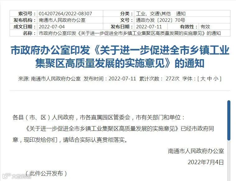 近日,南通出台《关于进一步促进全市乡镇工业集聚区高质量发展的实施意见》(以下简称:《实施意见》),加强全市乡镇工业的科学规划和合理布局,打造形成以省级及以上开发园区为主体,以重点中心镇、产业集聚特色镇为支撑的多层次乡镇工业空间布局。利用5-10年的时间,推动园区外企业入园进区,避免“村村点火、户户冒烟”。