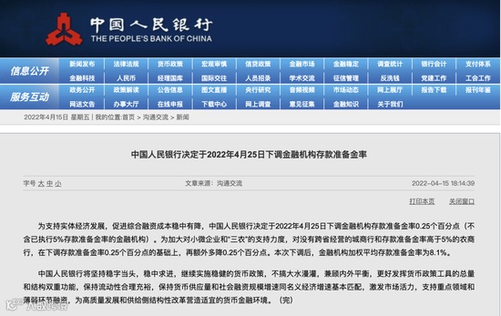 为支持实体经济发展,促进综合融资成本稳中有降,中国人民银行决定于2022年4月25日下调金融机构存款准备金率0.25个百分点(不含已执行5%存款准备金率的金融机构)。为加大对小微企业和“三农”的支持力度,对没有跨省经营的城商行和存款准备金率高于5%的农商行,在下调存款准备金率0.25个百分点的基础上,再额外多降0.25个百分点。此次降准共计释放长期资金约5300亿元,本次下调后,金融机构加权平均存款准备金率为8.1%。
