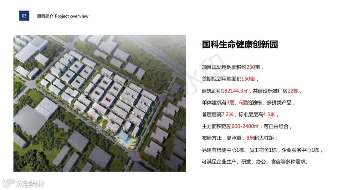 项目概况:项目总面积254亩,一期规划用地面积约150亩,建筑面积约14万方,规划3层、6层独栋双拼GMP标准厂房,面积段600-12000 m2,满足企业多种需求。