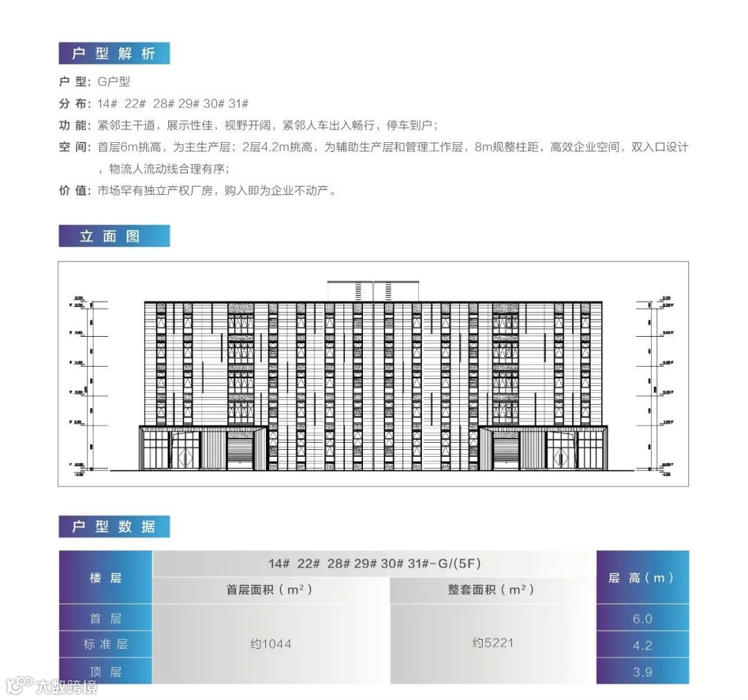 主力在售产品为5层框架厂房,面积区间约1044-5221㎡,首层6米挑高,2-4层层高4.2米,5层3.9米,8米规整柱距。拥有高效企业空间,双入口设计,人货分流合理有序。