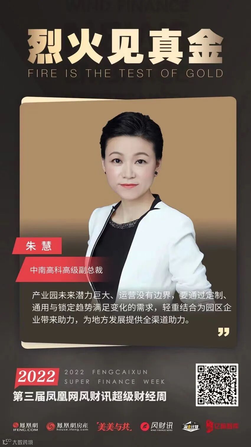 12月8日,凤凰网、凤凰网房产、风财讯联合多方机构,启动#第三届凤凰网风财讯超级财经周#。中南高科高级副总裁朱慧应邀出席论坛,与李肇星、聂梅生、冯仑等其他30余位顶层智慧一道,围绕不动产新格局、产业、商业等话题与全球经济学家、政商学界领袖云端对话,凝聚多方共识解析经济机遇及行业未来。