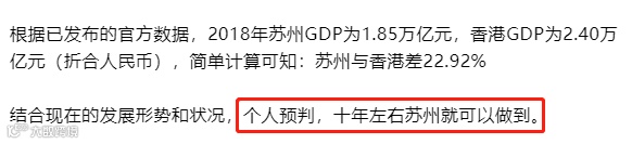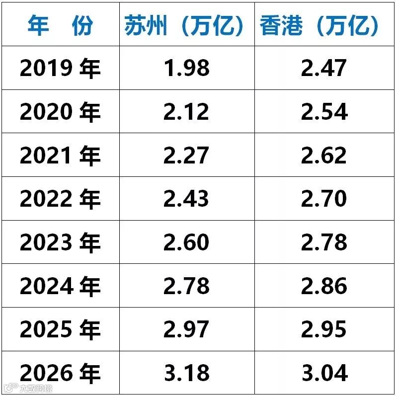据说苏预判,以2018年的增速来看,苏州GDP增幅为7%左右,香港GDP增幅为3%左右。假设接下来的8年,两地都一直保持这个增速,预计2025年苏州GDP将超越香港。