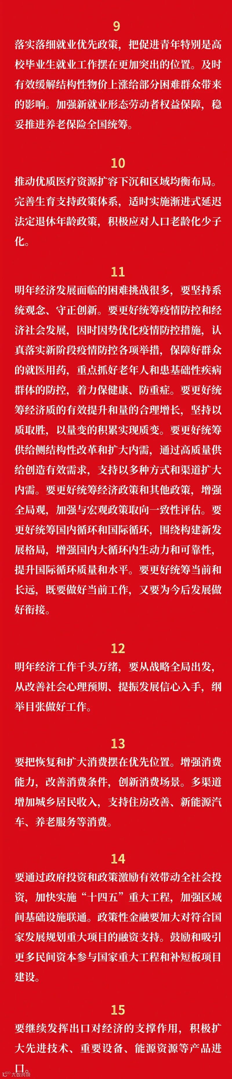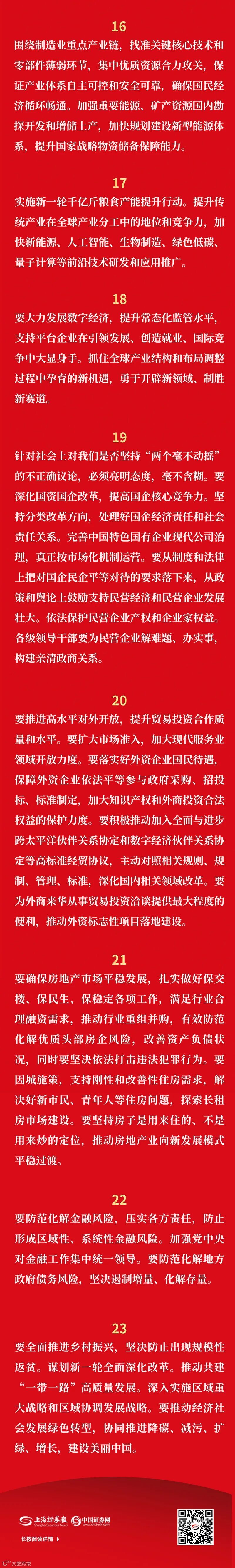 会议部署了财政政策、货币政策、产业政策、科技政策、社会政策五个方面的重点任务。在具体举措上,从着力扩大内需、加快建设现代化产业体系、切实落实“两个毫不动摇”、更大力度吸引和利用外资、有效防范化解重大经济金融风险等方面作出工作部署,其中有不少新提法,比如“要把恢复和扩大消费摆在优先位置”、“支持平台企业在引领发展、创造就业、国际竞争中大显身手”等等。