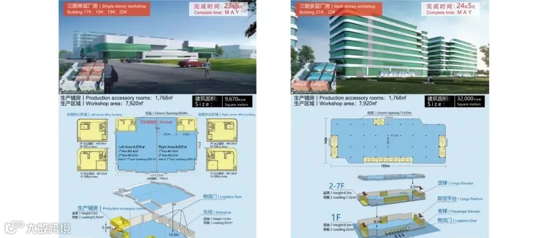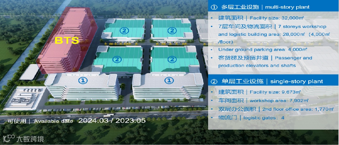 目前可提供租赁单层、多层两种类型的工业设施,分别为一期、二期已建成厂房、三期在建设厂房及另有可提供定制建设厂房的土地。