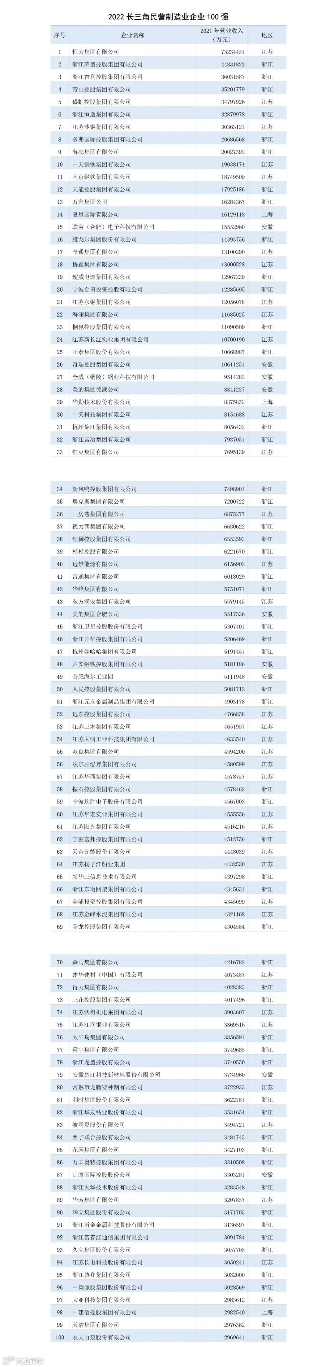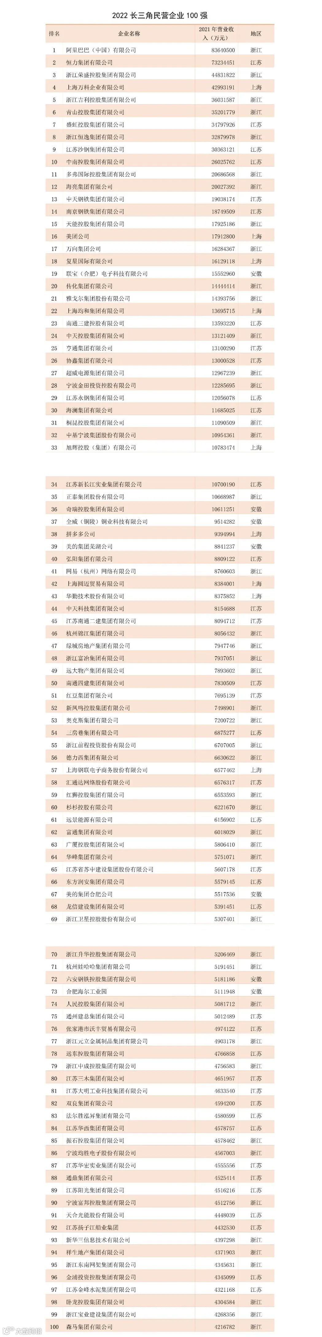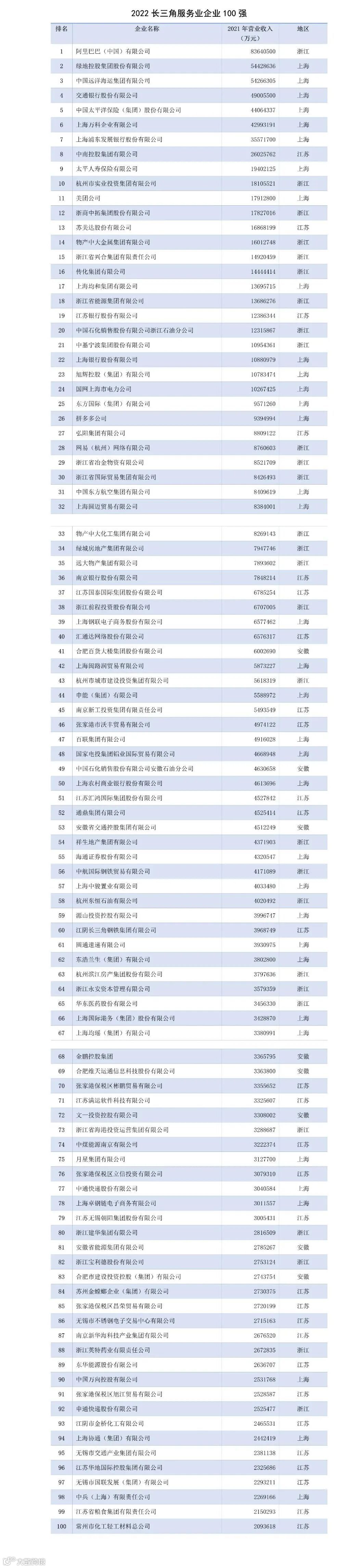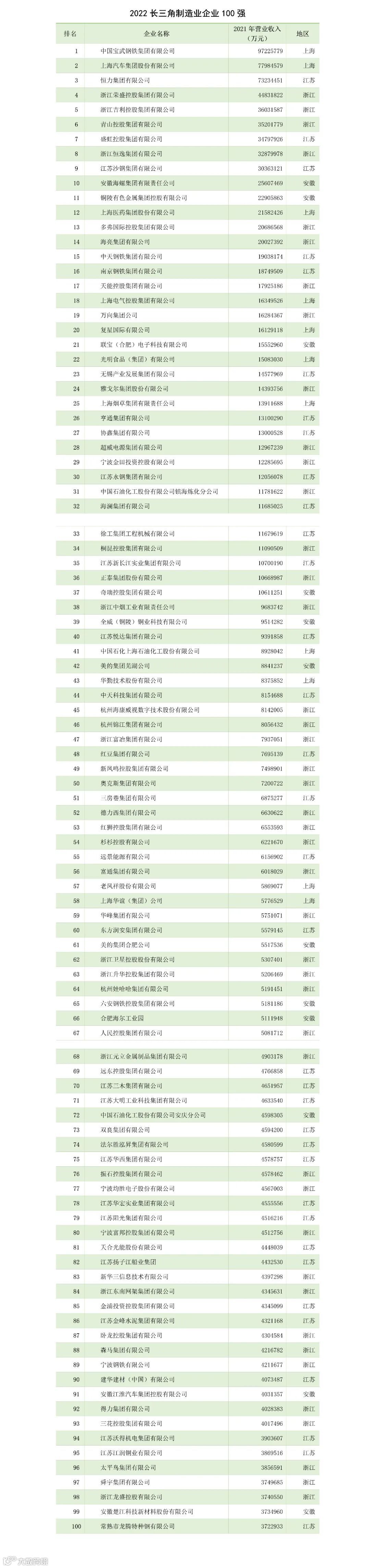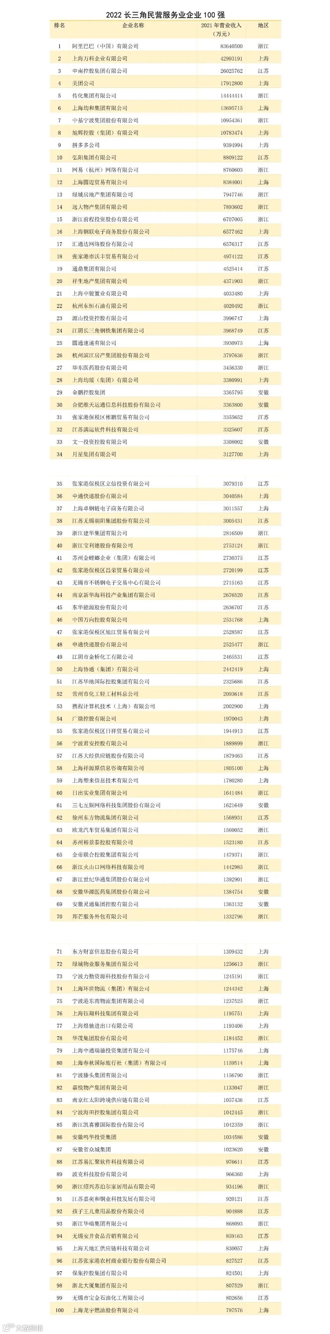 以下分别为2022长三角企业、制造业企业、服务业企业、民营企业、民营制造业企业、民营服务业企业100强榜单。