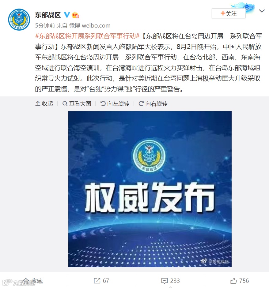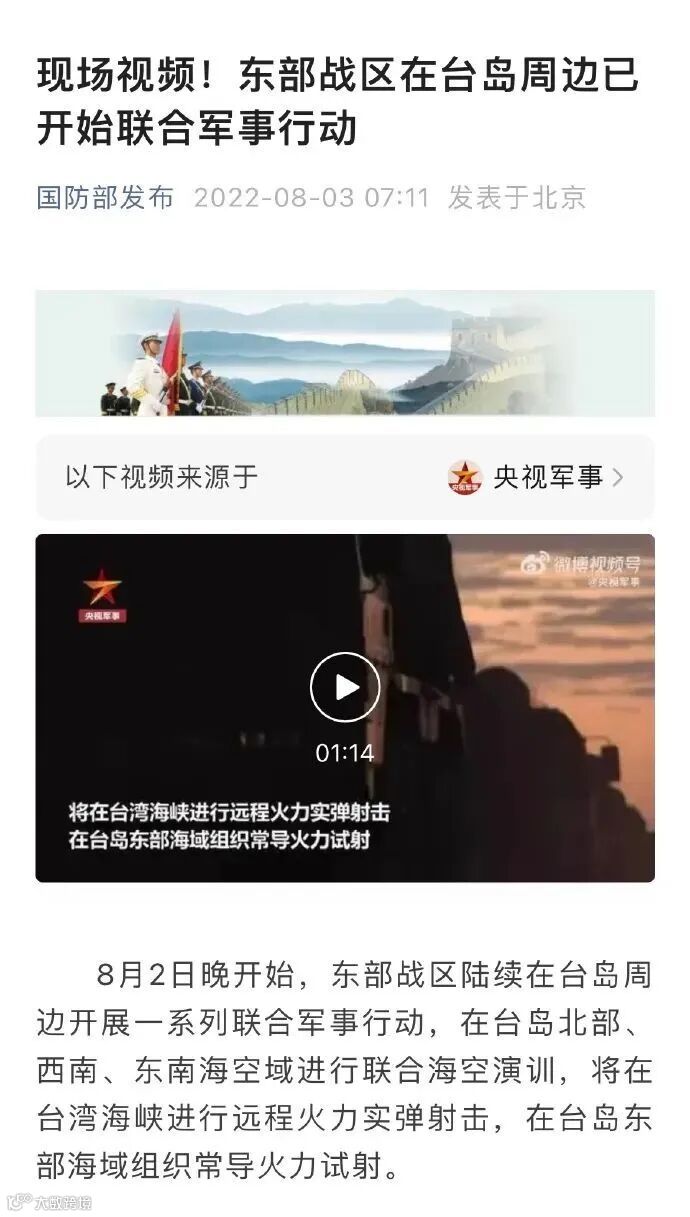 昨天晚上,在老妖婆落地松山机场后,东部战区发布通告,“将在台岛周边开展一系列联合军事行动,在台岛北部、西南、东南海空域进行联合海空演训,在台湾海峡进行远程火力实弹射击,在台岛东部海域组织常导火力试射。”