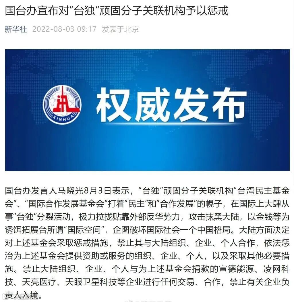 今天,国台办还发布一条重要信息,宣布对“台独”顽固分子关联机构予以惩戒。