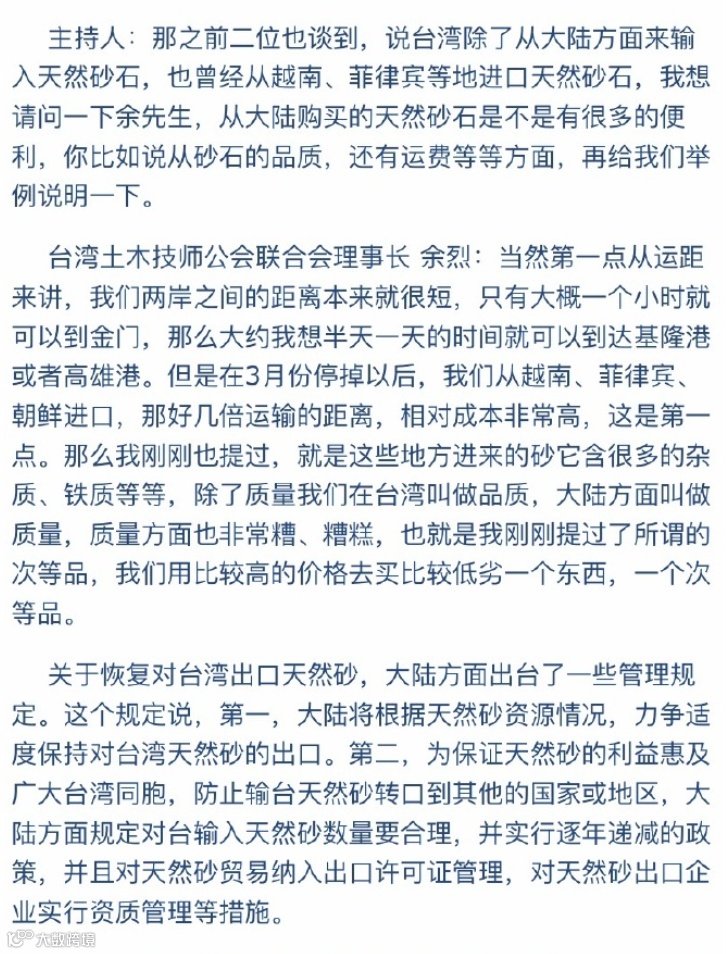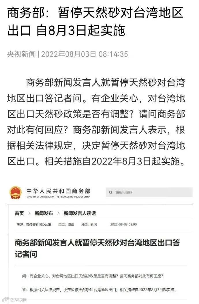 比如今天早上,商务部决定立即暂停对台岛的天然砂出口。
