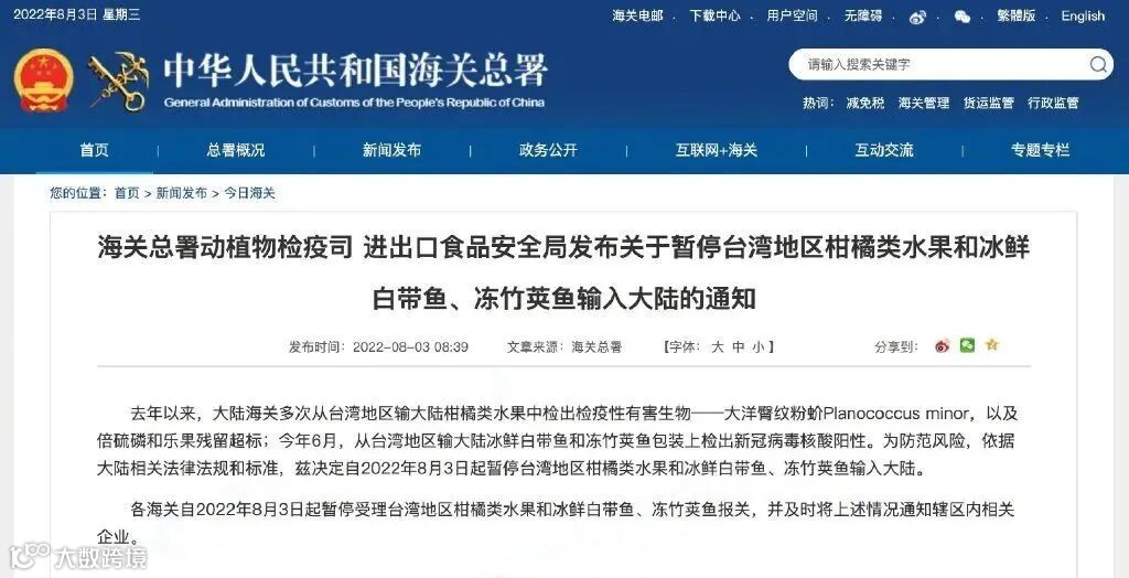 比如海关总署发布公告,今日起暂停台岛的柑橘类水果和冰鲜白带鱼、并竹荚鱼的输入。
