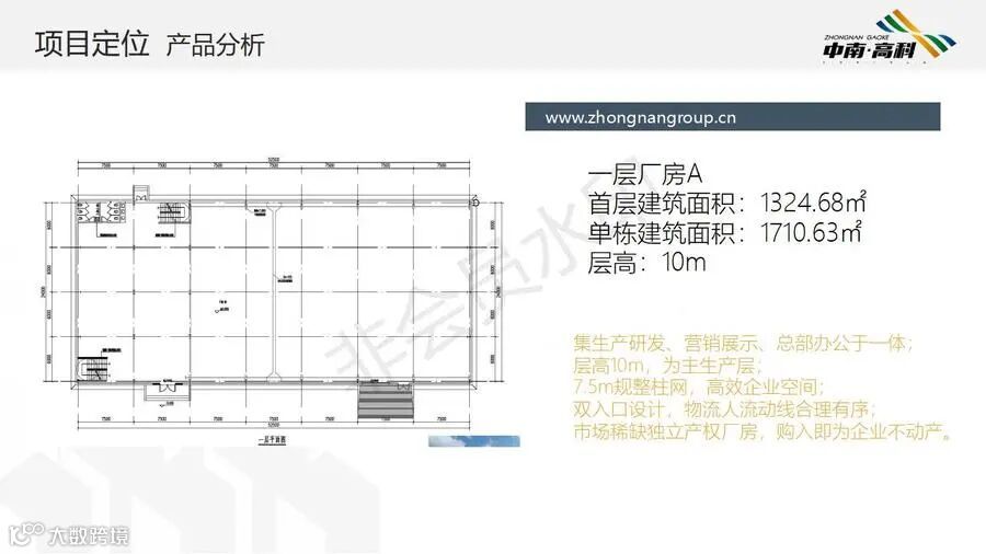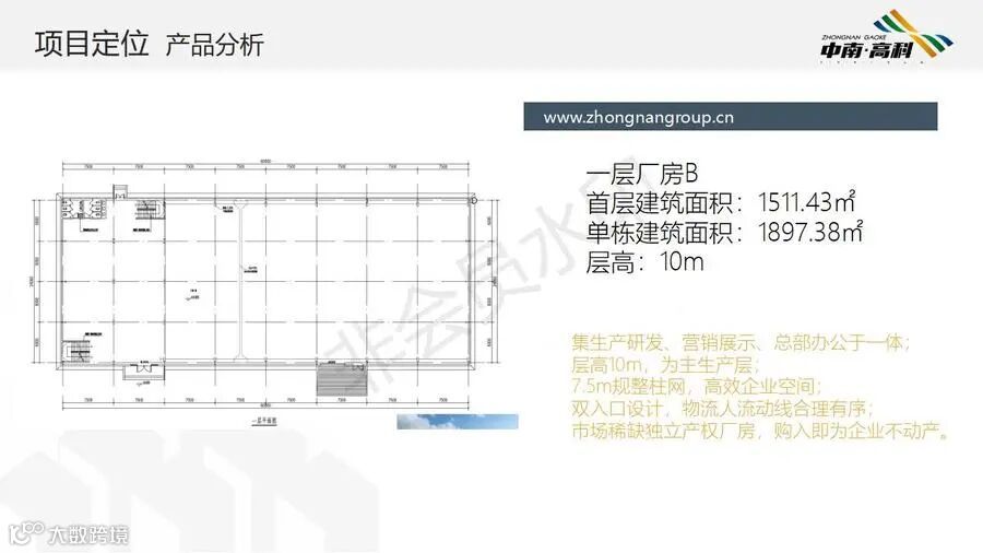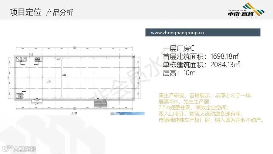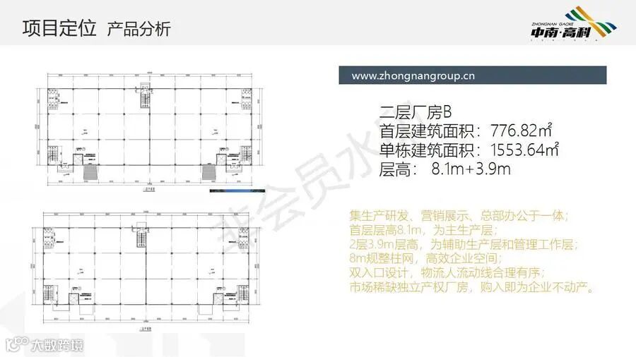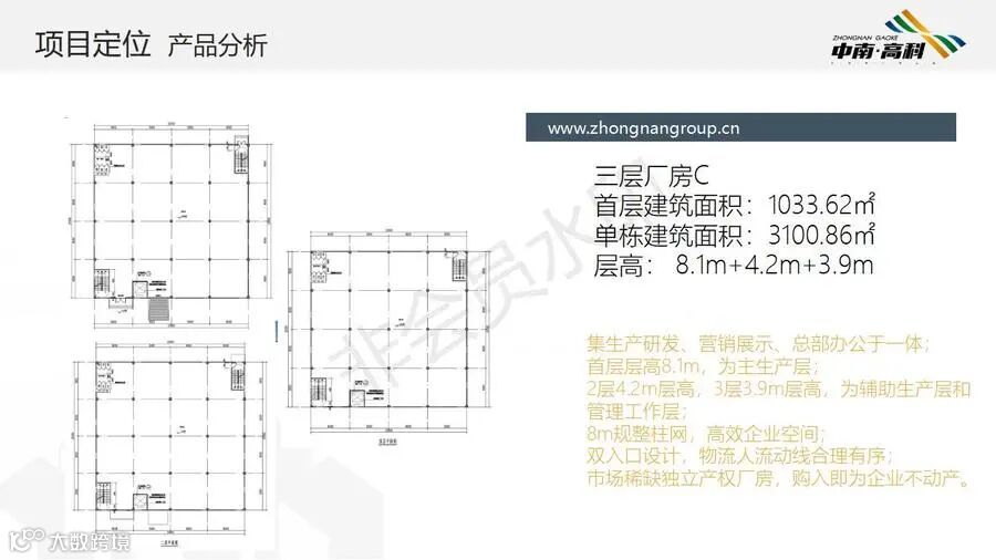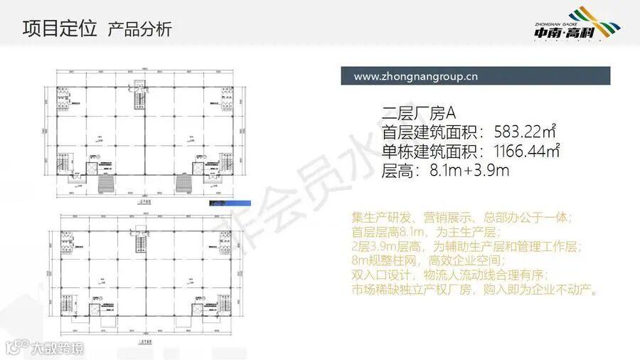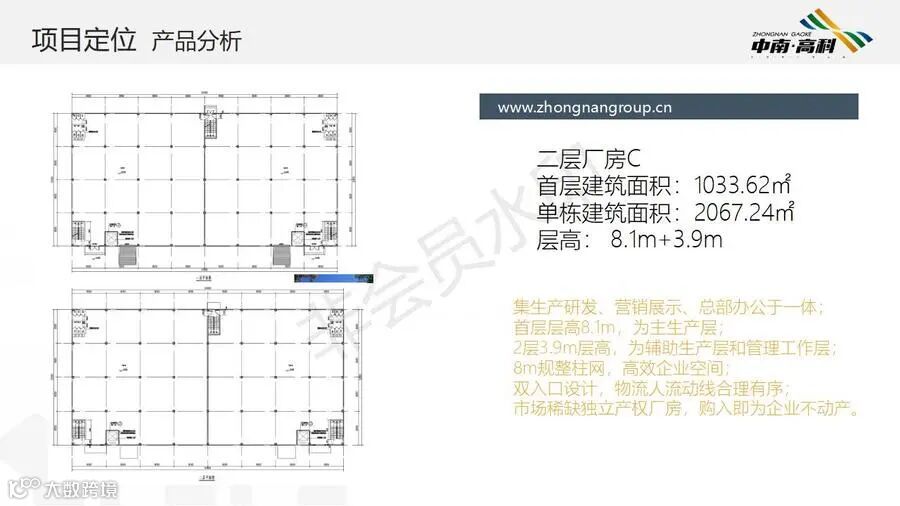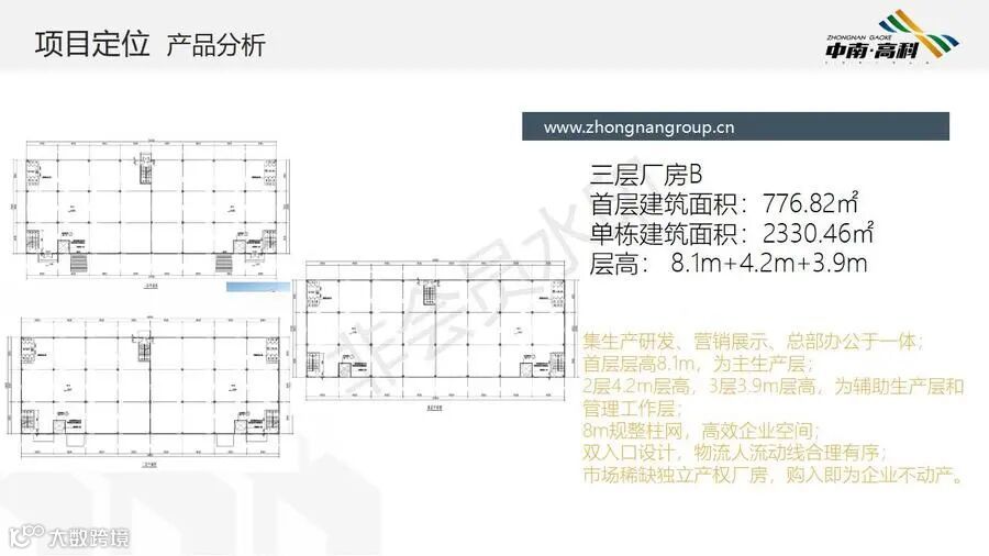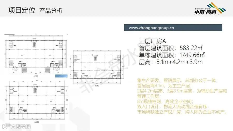 【层高】:两层框架厂房层高:一层8.1米,二层3.9米(6000平独栋,可分3个2000平出售) 三层框架厂房层高:一层8.1米,二层4.2米,三层3.9米(最小面积1500平/栋)