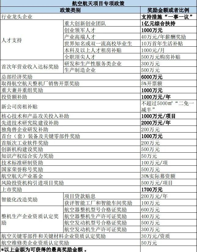 支持产业链项目落户。围绕国家大飞机工程、两机专项、航天工程等重大任务,突出发动机、航电系统、液压系统、起落架、机身结构件,以及关键材料、关键零部件、高端无人机等为重点,全力支持国内外行业龙头企业来我市投资或开展产业合作。具体奖励支持措施“一事一议”。