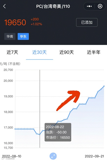 以华东市场,PC/台湾奇美/110为例,8月22日市场价为16550元/吨,时间来到9月21日,110已经上涨至19650元/吨,上涨3100元/吨,涨幅18.73%!