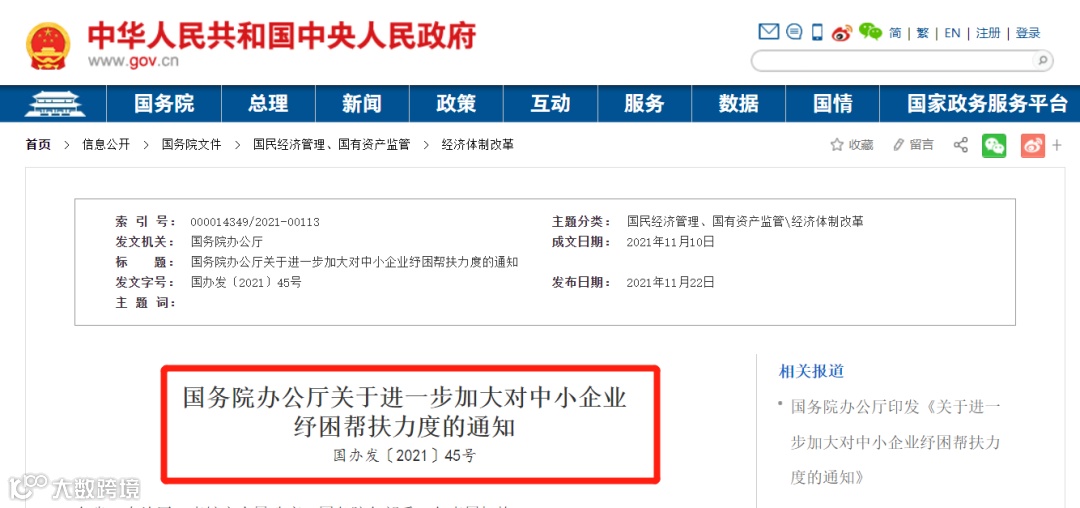 其实,在2021年11月,国务院办公厅印发《关于进一步加大对中小企业纾困帮扶力度的通知》: