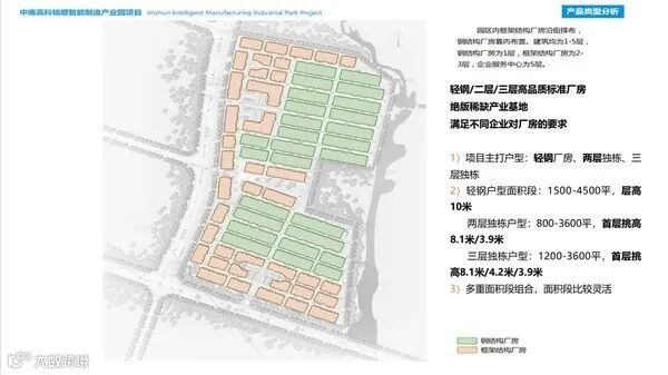 【层高】:纯一层轻钢高度10-11米,预留牛腿/ 两层独栋层高为8.1/3.9,三层为8.1/4.2/3.9,首层层高均在8.1米。