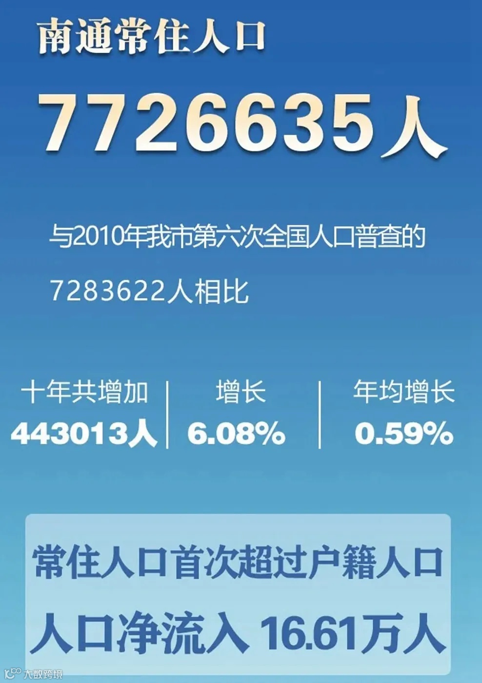 2021年5月24日,南通市第七次全国人口普查主要数据公布。2020年11月1日零时,全市常住人口为772.66万人,比2010年第六次全国人口普查增加了44.3万人,增长6.08%。常住人口首次超过户籍人口,人口净流入16.61万人;其中主城区崇川区常住人口为1183740人,超过户籍人口,实现人口净流入440252人,标志着南通的城市集聚力、吸引力显著增强。